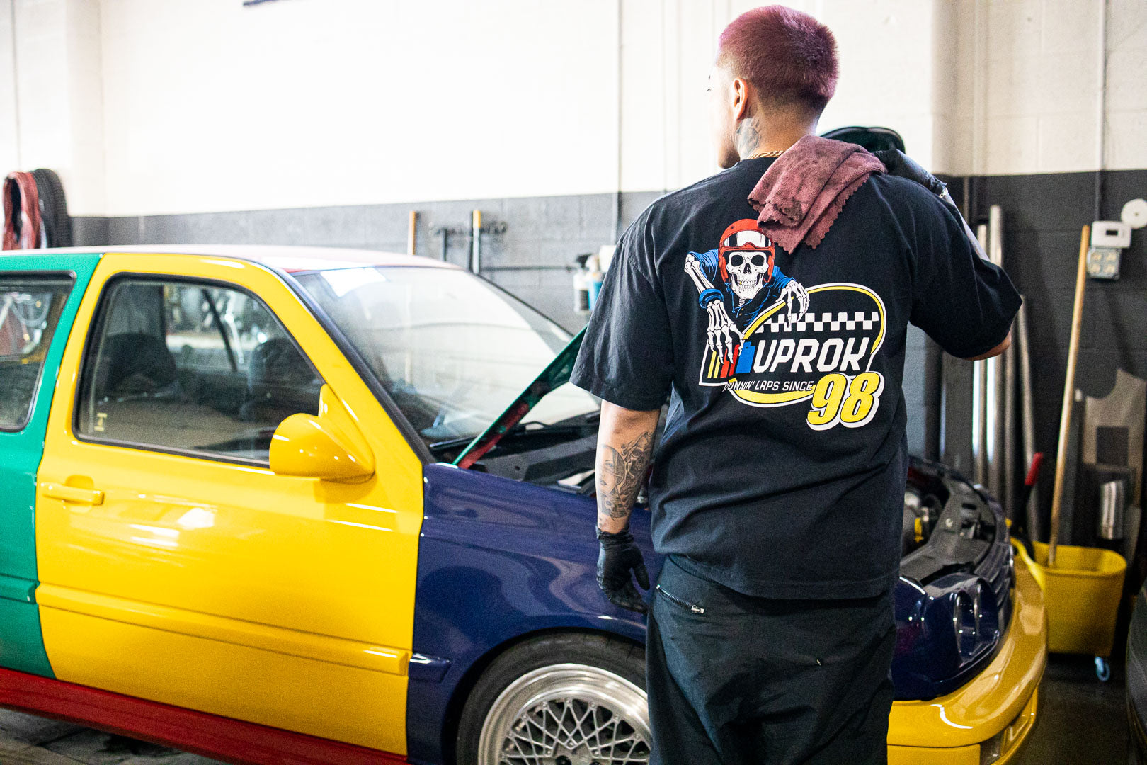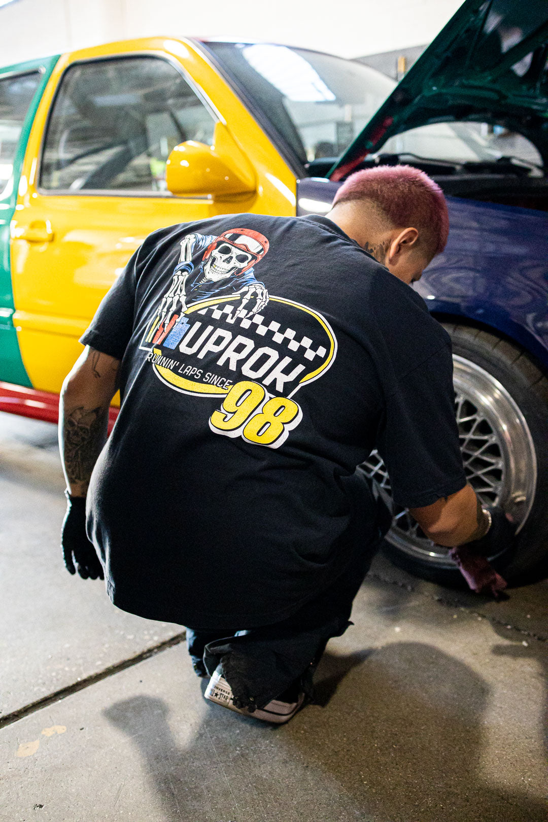 The Uprok "Raceway" T-shirt features an all new, never before seen Uprok Logo, This T-shirt features the Uprok "Raceway" logo on the front Chest with the "Running Laps" Uprok Skull Logo on the backside. Limited run. F/W25